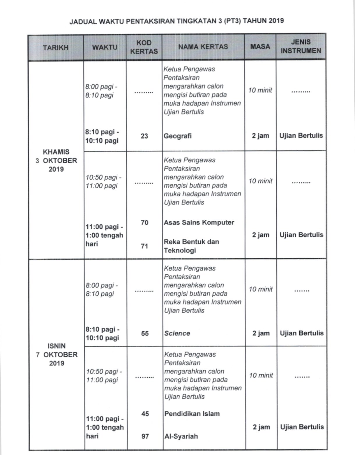 Jadual Waktu Peperiksaan Pt3 2019 Pendidikan Malaysia
